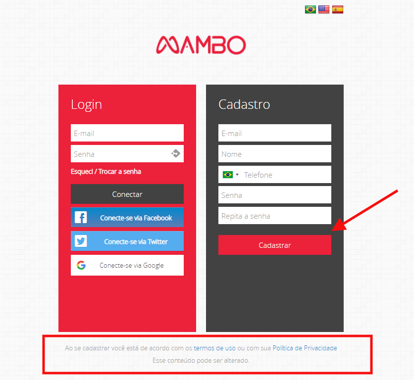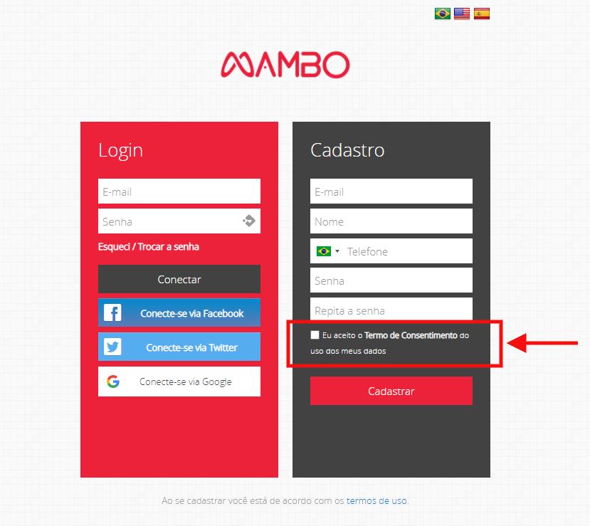 O Screenshot abaixo demonstra o formulário de cadastro sem o"checkbox" do termo de consentimento e a chamada do termos de uso customizada.