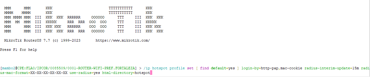 /ip hotspot profile set [ find default=yes ] login-by=http-pap,mac-cookie radius-interim-update=15m radius-mac-format=XX-XX-XX-XX-XX-XX use-radius=yes html-directory=hotspot