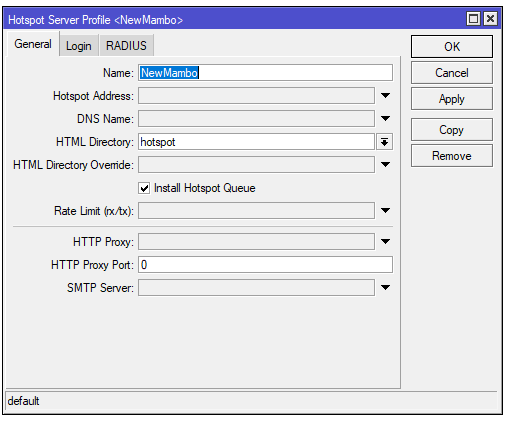 6 - Ainda em IP > Hotspot > Servers profile, modifique o Name do único profile para "NewMambo"