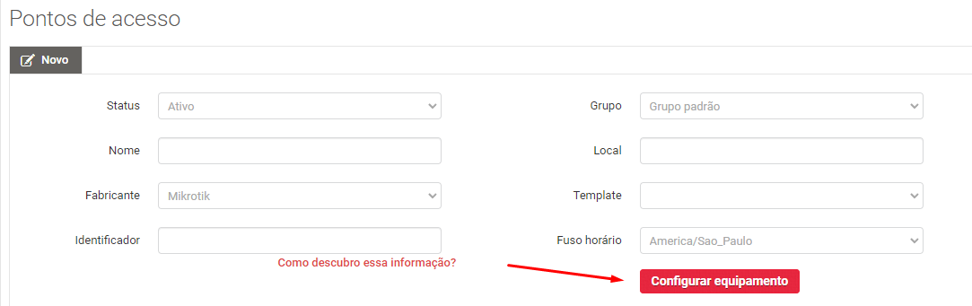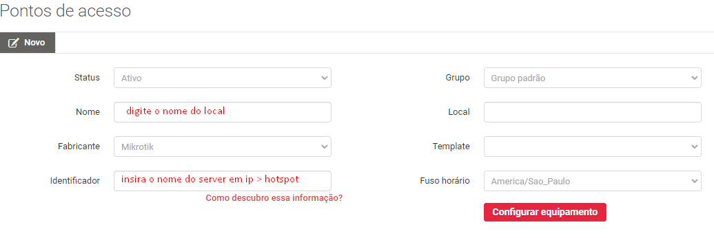 Identificador: Essa informação você possui dentro do Mikrotik, em ip > hotspot > servers, você deve cadastrar o Name que possui nesse local