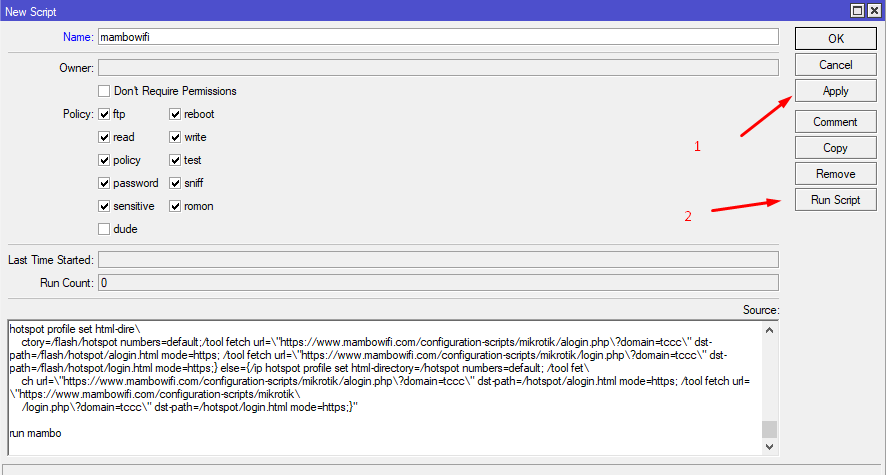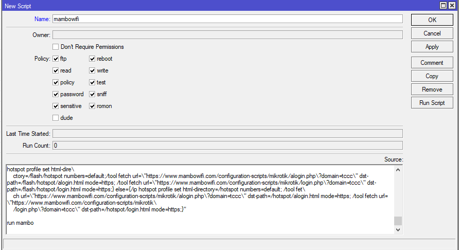 ctory=/flash/hotspot numbers=default;/tool fetch url=\"https://www.mambowifi.com/configuration-scripts/mikrotik/alogin.php\?domain=tccc\" dst-path=/flash/hotspot/alogin.html mode=https; /tool fetch url=\"https://www.mambowifi.com/configuration-scripts/mikrotik/login.php\?domain=tccc\" dst-path=/flash/hotspot/login.html mode=https;} else={/ip hotspot profile set html-directory=/hotspot numbers=default; /tool fet\