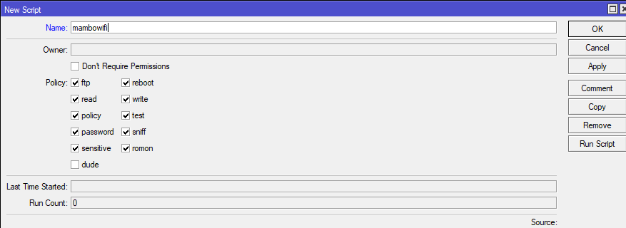 add name=mambo owner=admin policy=ftp,reboot,read,write,policy,test,password,sniff,sensitive,romon source=":if ([:len [/file find name=flash]] > 0) do={/ip hotspot profile set html-dire\