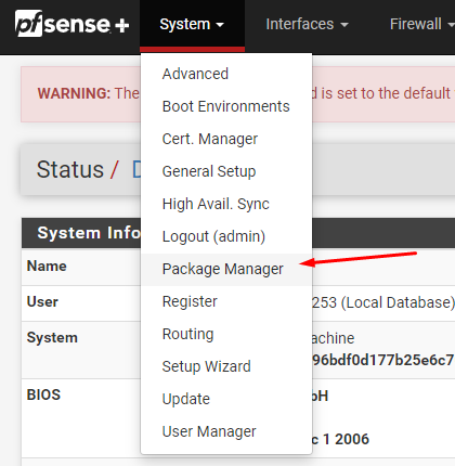 1 - Acesse o PFsense Plus e selecione a aba de System > Package Manager: