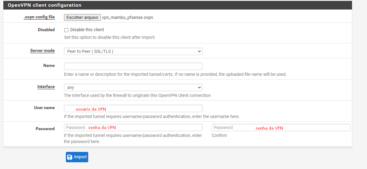 5 - Importe o arquivo em anexo desse artigo e deixe as configurações conforme abaixo, lembrando de colocar o usuário e senha da VPN feita no PHPMYADMIN