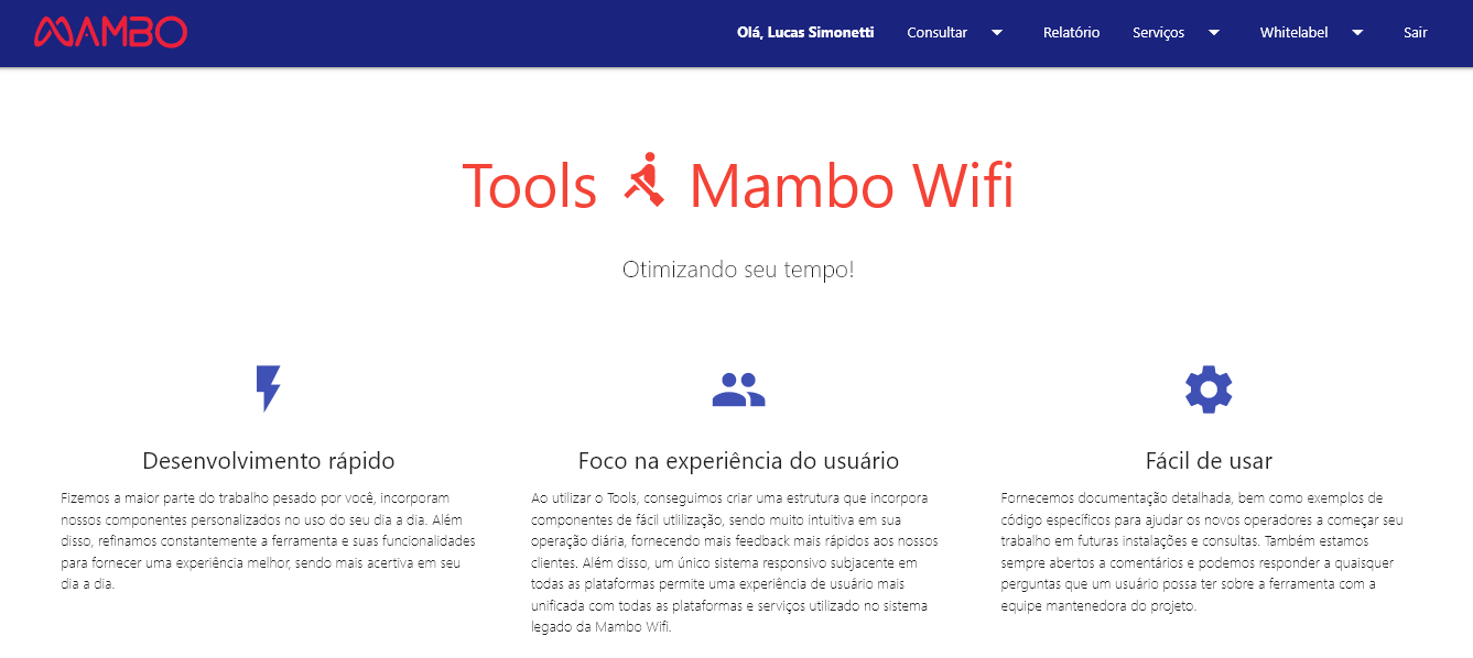 O Tools é uma ferramenta criada pelo Time de Tecnologia com o intuito de nos auxiliar. Nele, existem diversas ferramentas que podemos utilizar em nosso dia a dia. Acesse a URL https://tools.mambowifi.com/ e faça seu login.