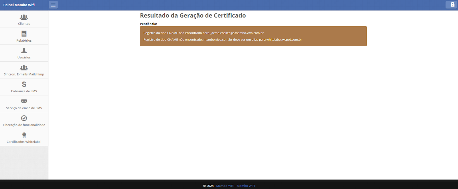 Se o apontamento CNAME do DNS não foi feito corretamente, você verá a mensagem que o CNAME não foi encontrado