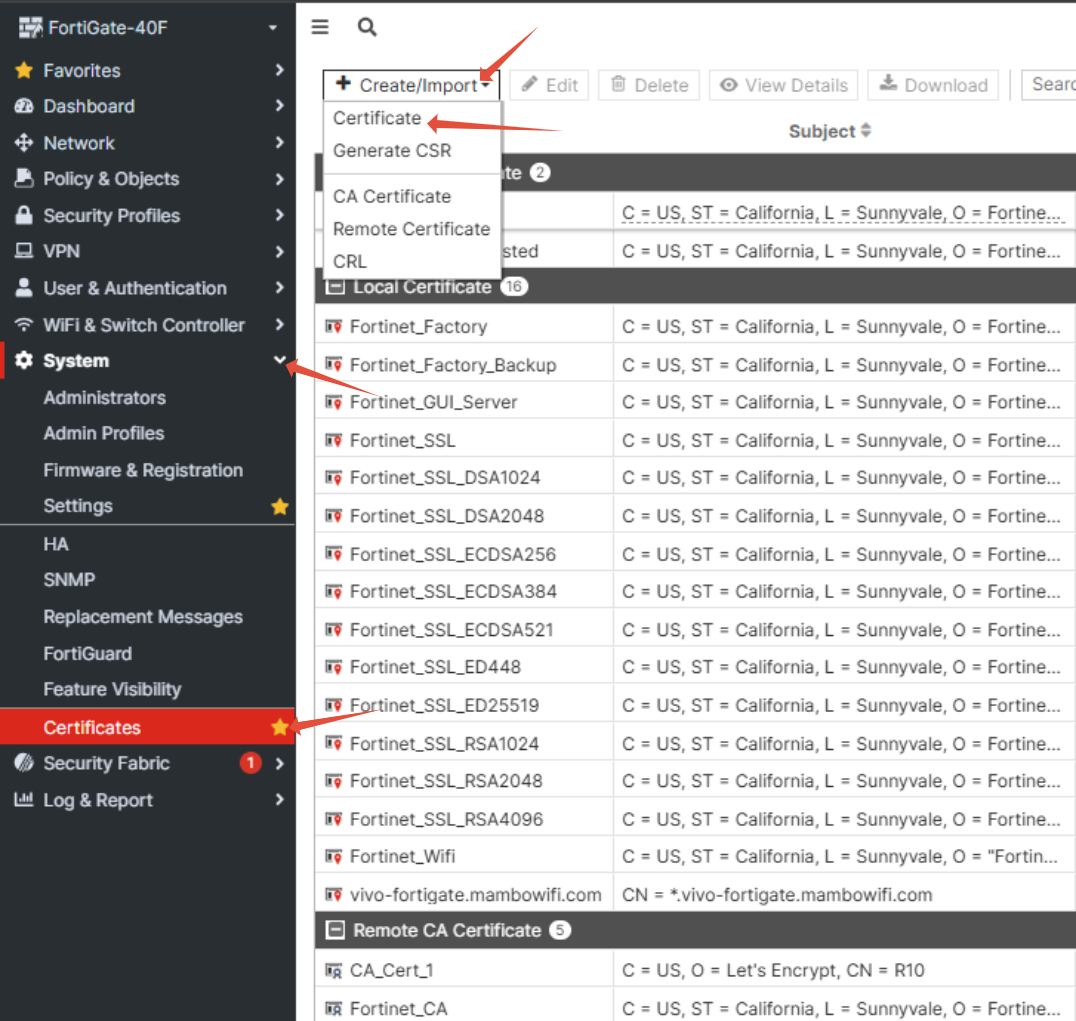 1° Acessar a System > Certificates > Create/Import > Certificate