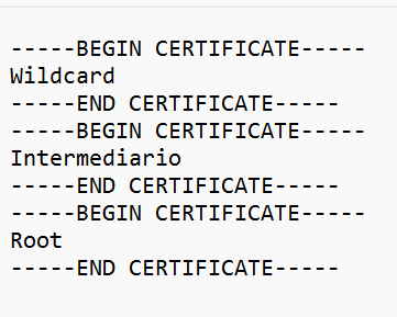 Será necessário abrir um bloco de notas e dentro dele imputar as informações que foram coletadas ao baixar os certificados nas etapas anteriores na seguinte ordem: Wildcard, Intermediário e Root, conforme exemplo abaixo.