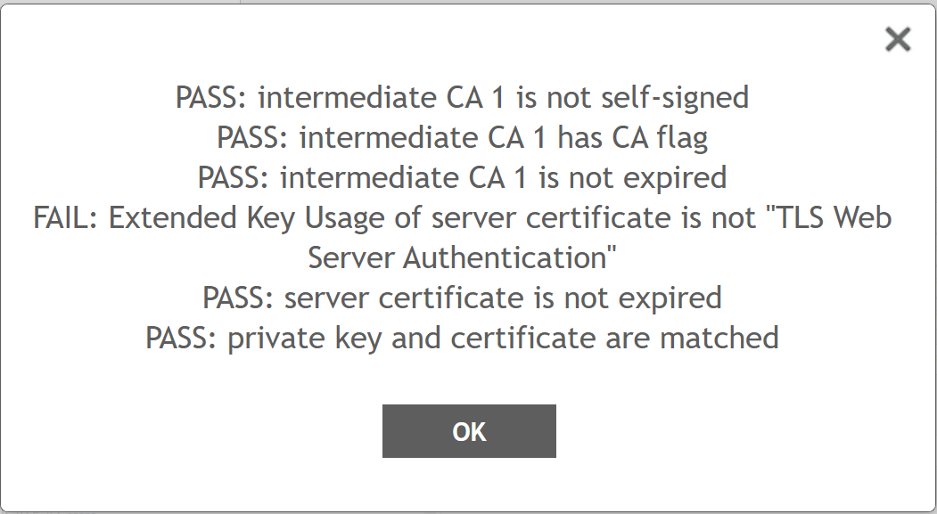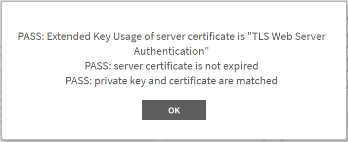 Obs: No caso de “FAIL” em - Extended Key Usage of server certificate is “TLS Web Server Authentication” - seguir com o uso do certificado, pois esse campo não irá impactar no funcionamento final, exemplo de caso funcional com “FAIL”