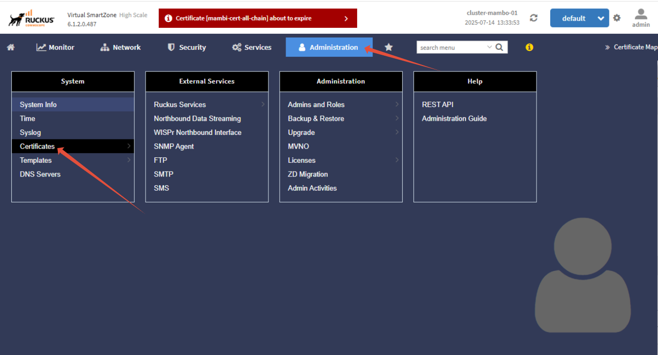 Acessar o campo “Certificates”, em Adminstration > System > Certificates. Obs: Em algumas versões o caminho é somente System > Certificates.