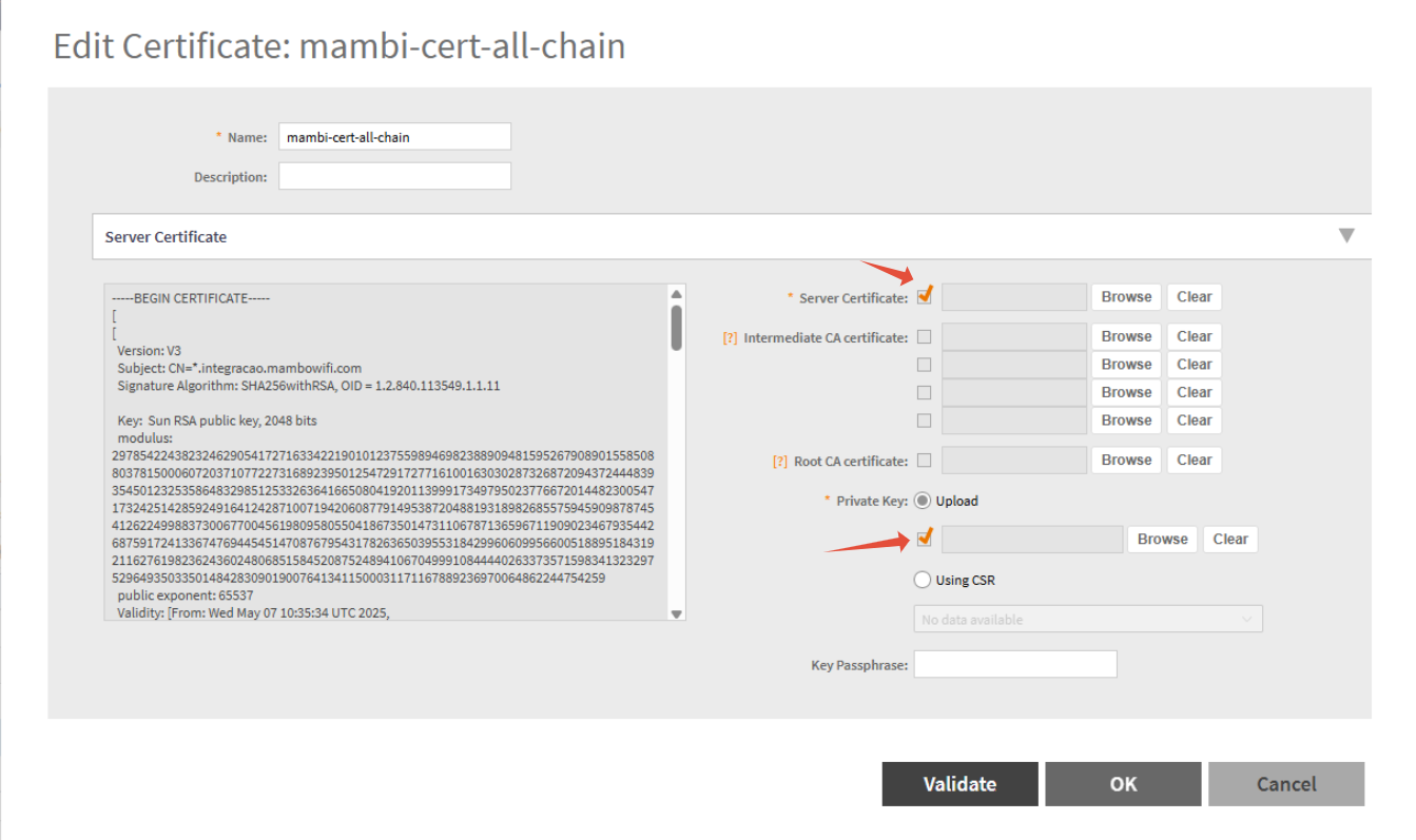 Aplicar o certificado com a cadeia completa em Server Certification e abaixo o arquivo Private Key.