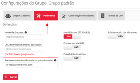 Na aba Parâmetros, insira o e-mail no campo "Remetente dos e-mails enviados para visitantes".