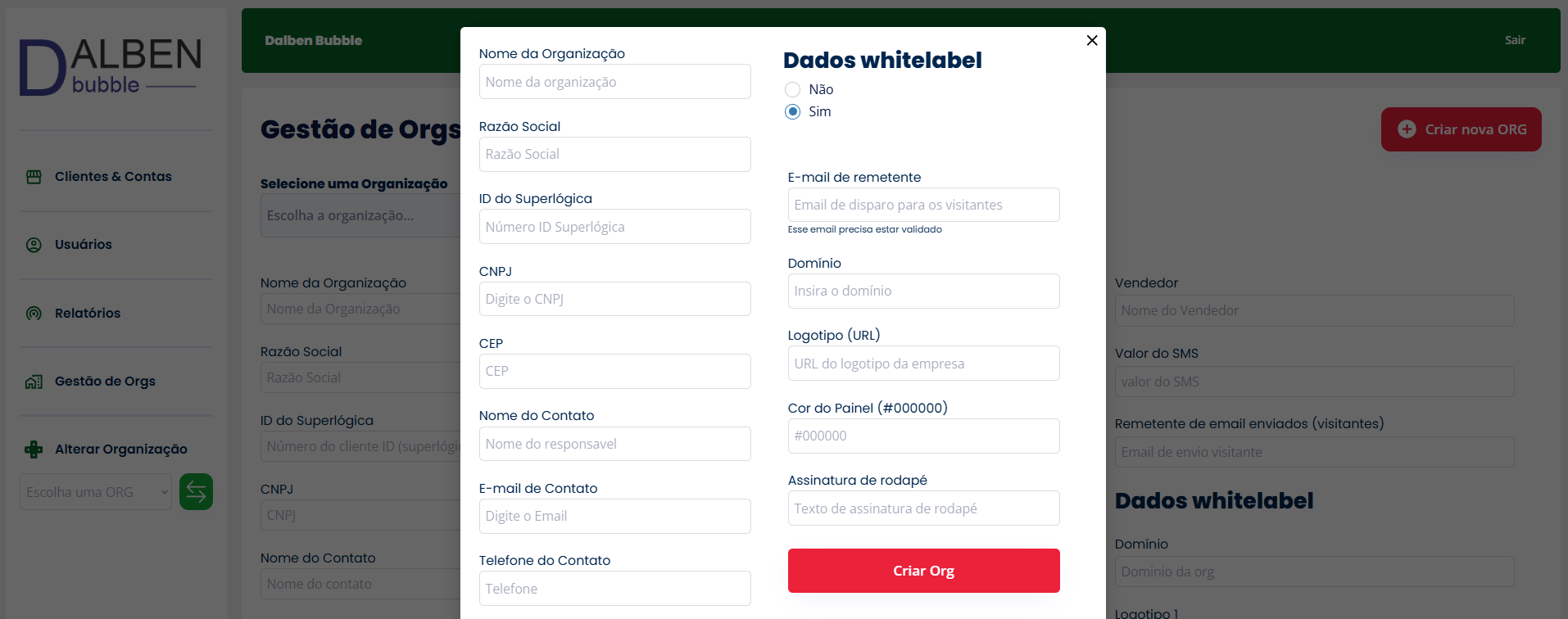Dados da Organização: Utilize as informações enviadas pelo Financeiro (Nome da organização, Razão Social, ERP ID, etc.).