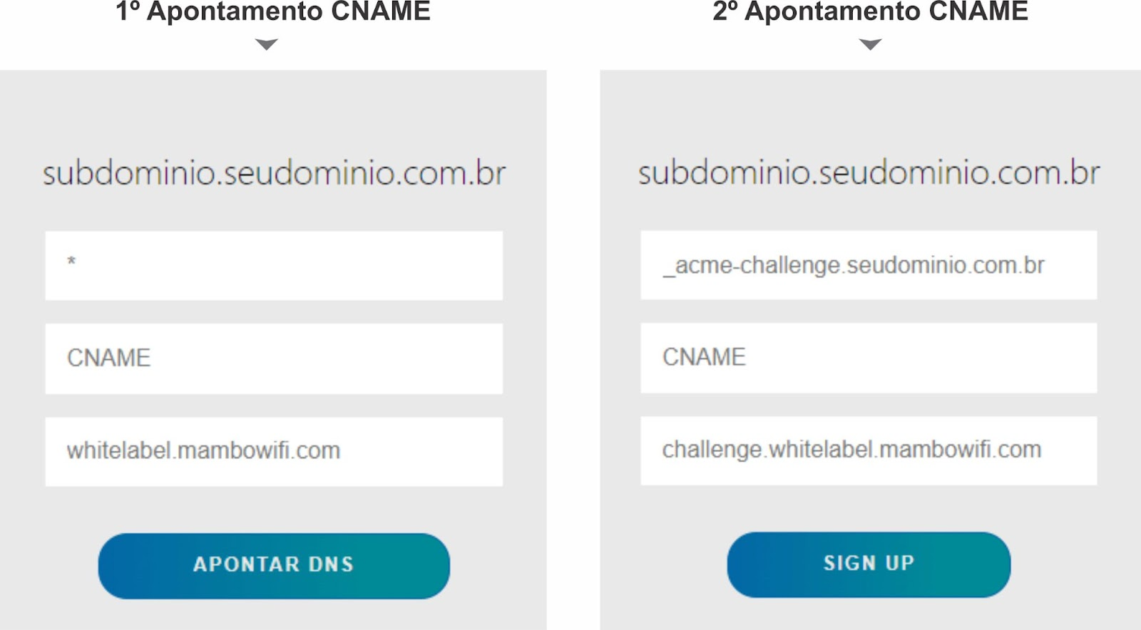 Apontar _acme-challenge.seudominio.com.br com TIPO CNAME para challenge.whitelabel.mambowifi.comObservação: Informe ao cliente que algumas plataformas de registro, como o Registro.br, não suportam o uso de wildcard. Nesses casos, o apontamento deverá ser feito para o subdomínio específico (ex: painel.seudominio.com.br).